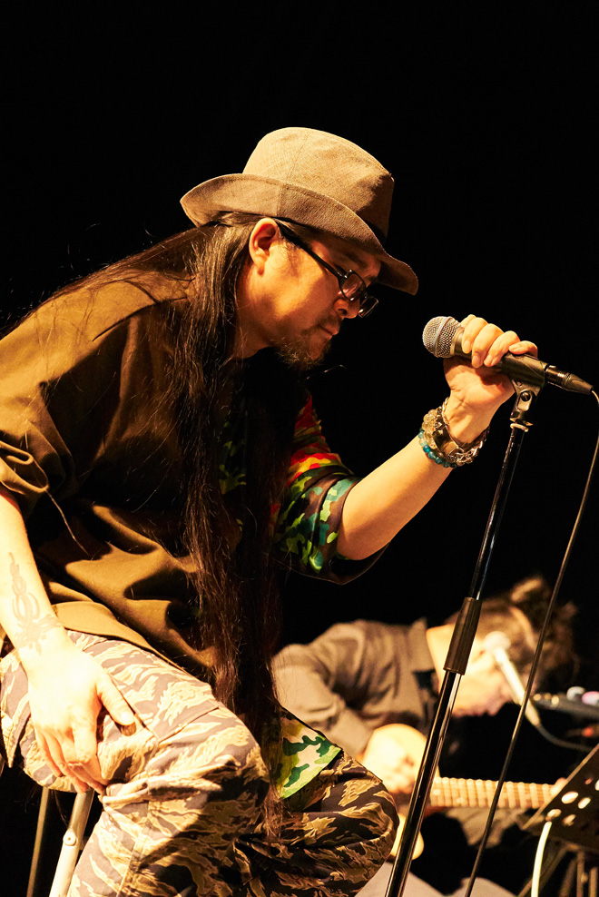 「30年活動してきたけど、上を見るとバケモノみたいなミュージシャンが沢山いて、気が遠くなる。バケモノのひとりに陽水さんがいます」と演奏されたのは、井上陽水の「傘がない」。本家は圧倒的な声質の方なので、陽水以外の人が唄えば自ずと印象は変わるだろうと思っていたが、上杉はガナリやシャウトも交えた彼らしいアプローチ。行かなくちゃ行かなくちゃと思いながら行くことができない主人公の迷いや葛藤、頼りなく揺れる気持ちが見えるようで、原曲とは一味もふた味も違う、ある意味リアリティのある「傘がない」を聴かせてくれた。