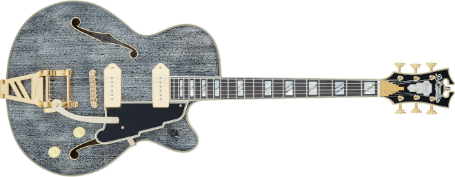 ピックアップは、セイモア・ダンカンのディアンジェリコ・グレート・デーンP90を2基搭載。コントロールは1ヴォリューム、1トーンで、3ウェイ・ピックアップ・セレクター・スイッチを採用。また、クリーム・カラーのカップケーキ・コントロール・ノブやブラック・カラーのチキンヘッド・スイッチ・ノブがクラシックなルックスを演出。ハードウェアはゴールドで、グローバーのインペリアル・マシンヘッド、ローラー・チューンOマティック・ブリッジ&ディアンジェリコ・シールド・トレモロB-70の仕様。フィニッシュはグロスで、マホガニーの導管を生かしたフィニッシュのブラック・ドッグ・カラーとなる。