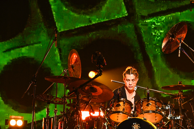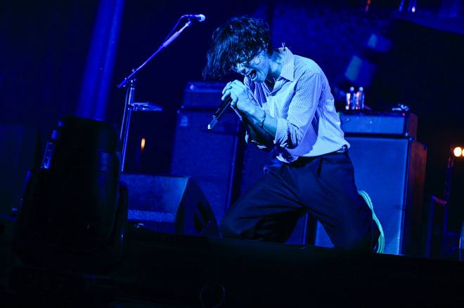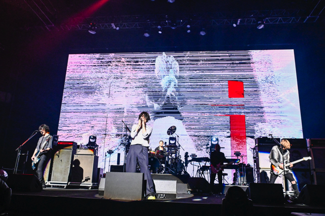 続くMCでは、プライベートでの武道館での思い出を振り返る。川上が「俺と白井くんのふたりでノエル・ギャラガーのライブを観に武道館に来たときに、最後の“Don’t Look in Anger”を、肩を組んで歌って。そのときに、“高校からこいつと一緒にバンドやって、今も一緒にノエルの歌を歌っているの最高だな”と思った……そんな武道館の思い出があるんだけど、覚えてる?」と白井に問うと、白井は「今、思い出しました」と、すっとぼけてみせる場面も。そんな白井が強烈にギターをかき鳴らし歌ったBLANKEY JET CITY「赤いタンバリン」の一節に続いて始まった「You Drive Me Crazy Girl But I Don’t Like You」で再びバンドはボルテージを上げていく。「武道館のかわいこちゃんに捧げます!」という言葉とともに始まった「Dracula La」では磯部がベースを弾きながらステージ上を動き回り、バンドのテンションは一気に頂点へ。続く、「月色ホライズン」の間奏でのメンバー紹介では、リアド、磯部、白井、ROSÉの順番に見事なソロ演奏を披露。最後の川上はソロ演奏の代わりにステージ中央でスポットライトを浴びながら、無言のまま立ってみせる。その“立ち姿”だけで、ロックンロールバンドのフロントマンとしての矜持を体現して見せる彼の威風堂々とした佇まいは、やはり別格だ。