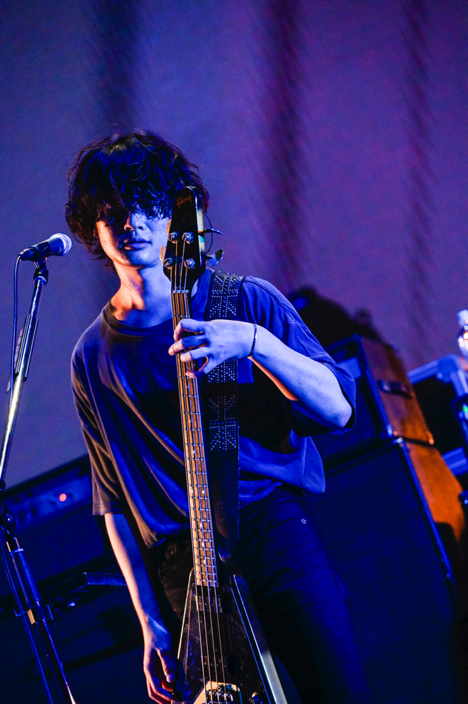 その後、川上が「一昨日、お誕生日だった後ろの人に 」と、10月25日が誕生日のリアドを振り向きアコギで「Untitled」を少し奏でると、続けて白井と共に、自身が出演する『Panasonic×花王「#センタク」』のCM曲を少し演奏するサプライズも。そして、「この曲は、できれば手拍子はなしでお願いします。他の曲は全然いいんです。でも、次の曲はうちらだけのビートで皆さんに届けたいので」と川上が観客に向けて語り、始まったのは「Travel」。このMCのあと、演奏が始まるやいなや、すぐに演奏を止めて「すいません、もう1回」とやり直す姿には微笑ましい愛嬌を感じたが、そんな“ありのまま”な姿も含めて、安易な一体感を求めるのではなく、ひとえに、自分たちの生き様と孤独を聴き手に届けようとするバンドの姿に胸打たれる。「Travel」は全編英語詞の楽曲だが、バックスクリーンには、歌詞の日本語訳も映し出される。