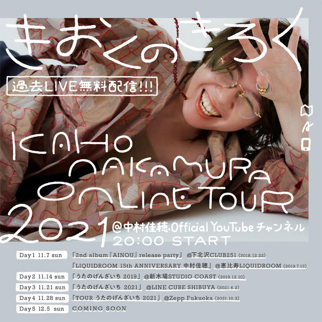 このオンラインツアーでは、2ndアルバム『AINOU』リリースパーティーをはじめ、SPACE SHOWER TVで過去に放送された特別番組や、初の全国ツアー<TOUR うたのげんざいち 2021>計5公演のライブ映像を配信。これまで中村佳穂がたどってきた3年間を振り返るツアーとなっている。