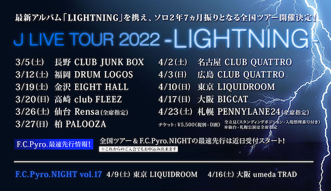 ひとつひとつ着実に成功例を積み重ね、今回約2年7カ月振りとなる全国ライヴツアー<J LIVE TOUR 2022 -LIGHTNING->の実施が決定。なお、2022年は、Jがソロ活動25周年を迎える記念イヤーでもある。