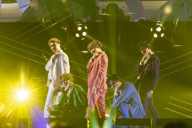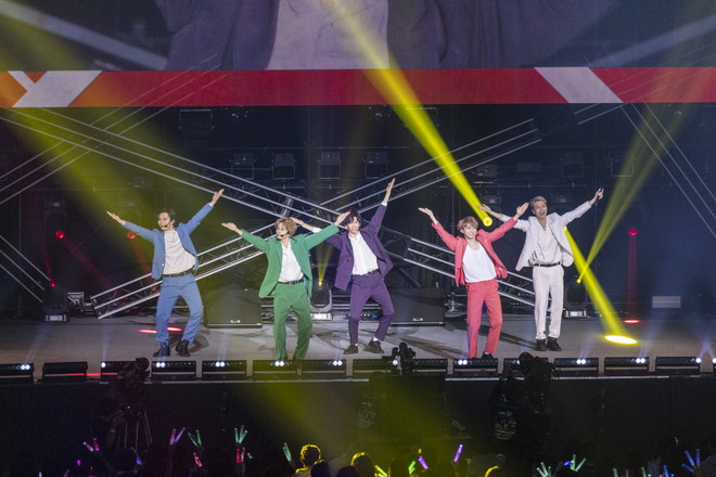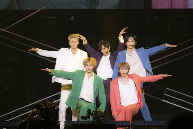 超特急の出番となりOvertureが流れると、ペンライトが鮮やかに会場を照らし、メンバーカラーのスーツを着たメンバーが登場。「SAY NO」からアクセル全開でステージがスタートし、曲中ではNiziUの縄跳びダンスを歌いながら踊るなど、1曲目から超特急らしさ全開で会場全体が釘付けに。