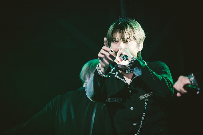 続いて、手首とうなじを撫でつける香水ダンスと、彼らを染める紫の灯りから芳香が漂ってきそうな「Breathe」を挟み、さらにSWAGを沸かせたのが「Say My Name」だ。『FAKE MOTION』で森崎ウィン、板垣瑞生らが演じていた都立八王子南工業高校のテーマ曲で、本来はバンドチューンだが、9月のイベントでONE N’ ONLYがカバーした際、あまりの相性の良さに“ぜひ今後もライブでもやってほしい”と絶賛コメントが殺到。その熱望に応えての登板となったわけだが、挑発的なラップに代表される彼らのワイルドな個性はゴリゴリのハードロックと確かに親和性抜群で、メンバー全員で合わせる声の圧にも圧倒されるばかり。大きく身体を振ってボディバンギングまでかます6人に湧いた拍手は、遠くない未来に恐らく大歓声になるだろう。