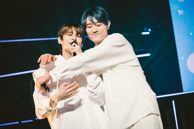 さらなる新曲「Be Mine」は爽快なロックチューンで、6人はタオルを振りながら壇上に駆け上がり、さらに駆け下りると客席ギリギリまで身を乗り出して客席を煽動。ペンライトを回すSWAGたちと熱い一体感を創り上げ、“愛を届けたいTonight”と締めくくると、すかさずKENSHINが「ありがとう! 僕たちから愛を届けます」とラスト曲「My Love」につなぐのも見事だ。