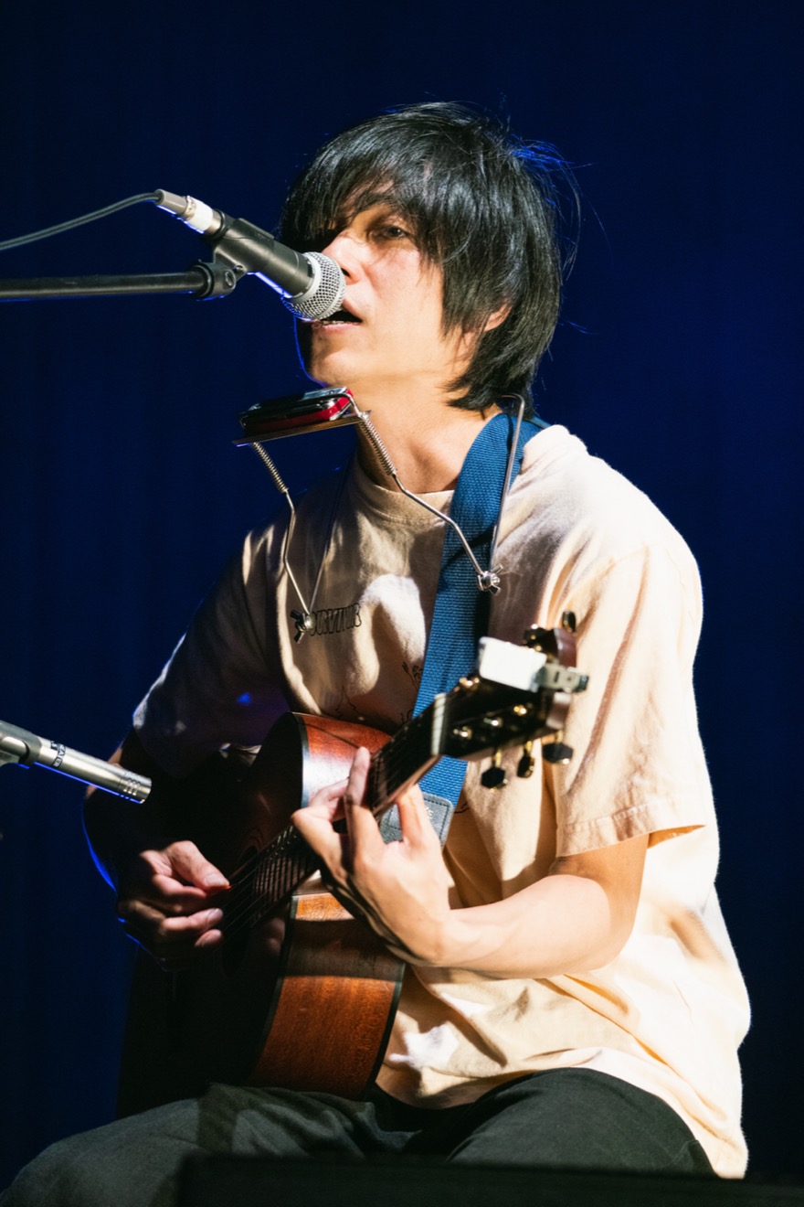 椅子に座ってアコギを構え、ハープを首にかける――といういわゆる弾き語りのスタンダードなスタイルが、このイベントでは異質に思えるのがおもしろい。「夕暮れのハイ」から「雨の散歩道」へ繋ぎ、個性がぶつかり合ったあとのホールの空気をオーガニックな佇まいで以て自分の色に染め替えていった。