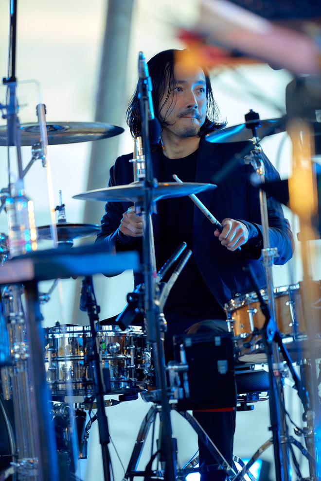 これまでも大地の芸術祭や瀬戸内国際芸術祭の犬島など数少ない機会でパフォーマンスを見せてきたYEN TOWN BANDだが、映画『スワロウテイル』公開25周年を記念して開催された今回のライブの舞台となったのは、小林武史が設立した千葉県木更津市のサステナブルファーム&パーク、クルックフィールズ。ステージの向こう側には農園やソーラーパネルが、振り返ると牛や羊やヤギの姿が目に入る解放感に満ちたフィールドだ。多国籍感あるフードエリアも含めて、その場が持つムードは、映画『スワロウテイル』に登場する「円都」の雰囲気に通じ合うものがある。資本主義社会の経済合理性に対するカウンター精神という意味でも映画とのリンクを感じる。