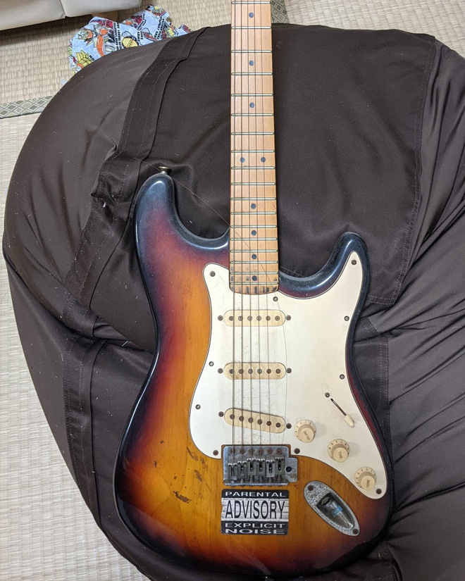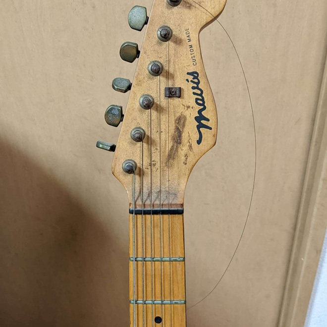 約25年前(1997年)に生まれて初めて買ったギターです。石橋楽器のオリジナルのMavis。アンプや初心者セット込みで19800円だったかな?