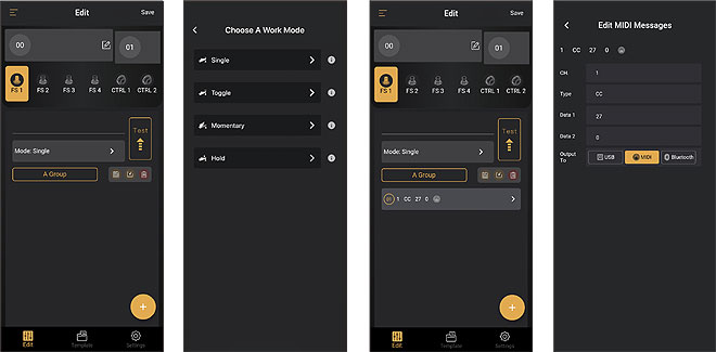 本体には4つのフットスイッチを搭載。1回のスイッチングごとに16の異なるMIDIメッセージを送ることができる(32MIDIメッセージを2グループに分けることも可能)。プログラムチェンジ、コントロールチェンジ、ノートオン/ノートオフといったMIDIメッセージを、MIDI、USB、Bluetoothで出力。プリセットの変更、エフェクターやマルチのオン/オフ、DAWのプレイ/ストップなどを自在にMIDIコントロールできる。