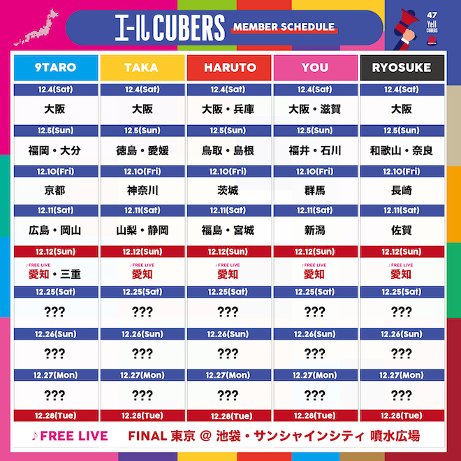 ※12月25日(土)の???は北海道/青森・岩手/千葉・埼玉/高知・香川/沖縄のルートを予定しております。各メンバーがどのルートになるかを11月9日(火)20時〜生配信するYouTube Liveにて”くじ引き”で決定いたします。