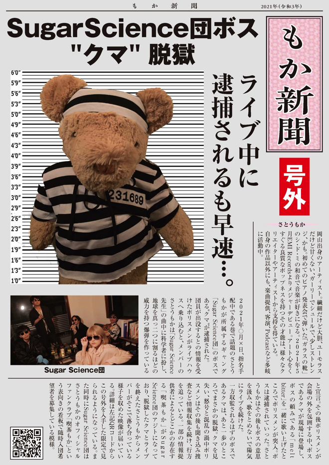 なお、終演後、会場ではボスのくまが早速脱獄したと報じる号外新聞チラシが配布された。新聞内のQRコードからは、Sugar Science団がアジトである「喫茶もか」でボスと合流する様子を見ることができる。ファンクラブ「喫茶もか」では今後、会員向けにツアーや制作のオフショット、メイキング映像、ブログなどを公開していくということだ。