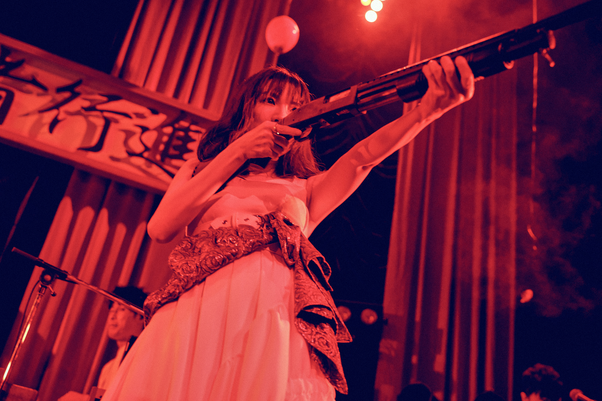中盤の、いやこのライブ全体の核心を成すのは、「死に損ないのパレード」だろう。かつて人生のどこかで、生と死の境へ追い詰められ、それでも生きていたいと願った人。そんな死に損ないを、開き直った陽気なパレードへと誘うこの歌を、悲しみでも絶望でもなく、勇気と笑顔で歌う渚。死と生が反転し、逆転人生の幕開けを高らかに告げる。渚がライフル銃を持ち出し、ステージ上に幸せの紙吹雪をまき散らす「象に踏まれても」の、逆境を笑い飛ばすパワーに圧倒される。間違いなくこの日の音楽的瞬間最大風速を記録した、「ダ・カーポ」のすさまじいスピードにぶっ飛ばされる。