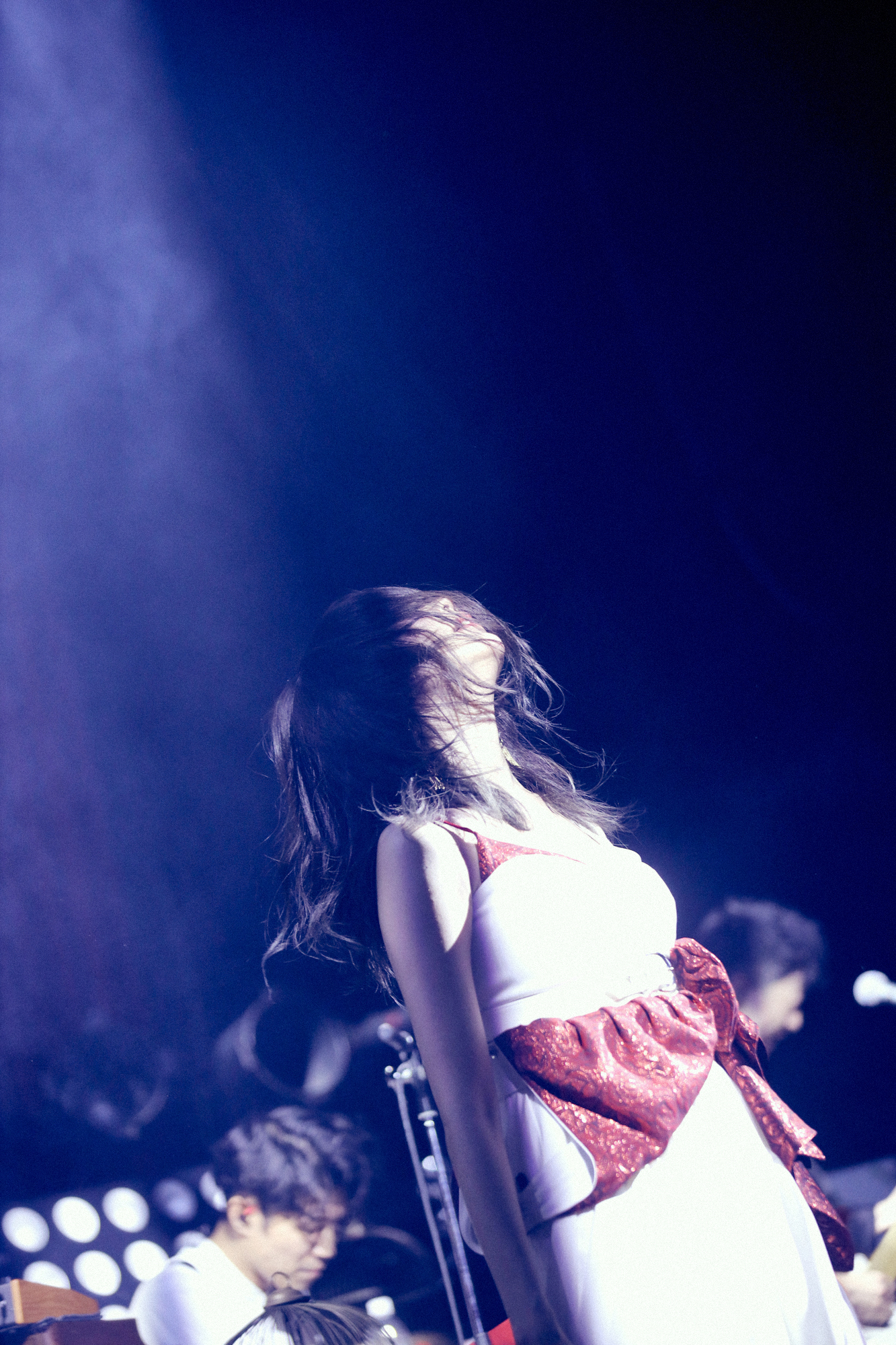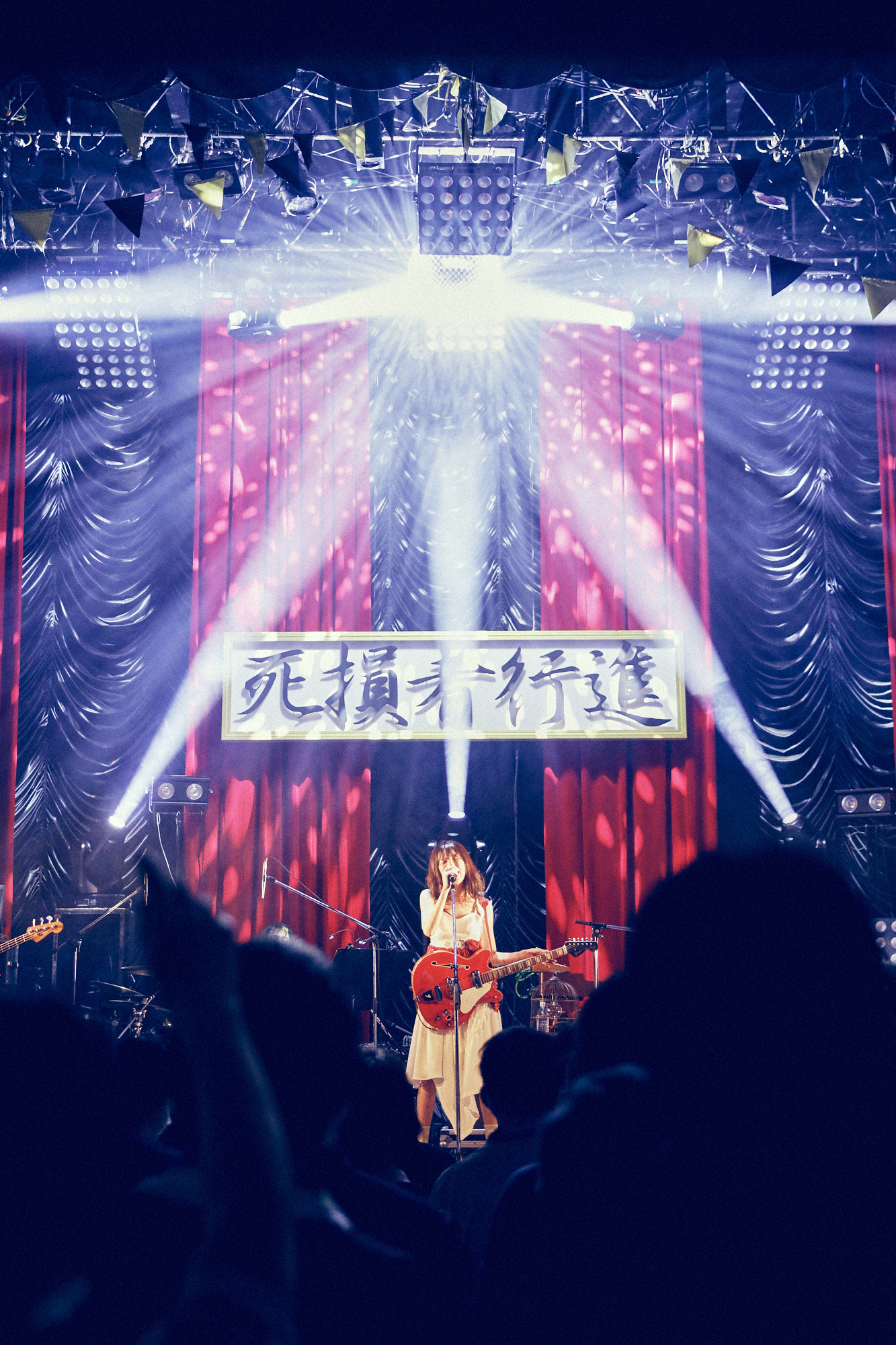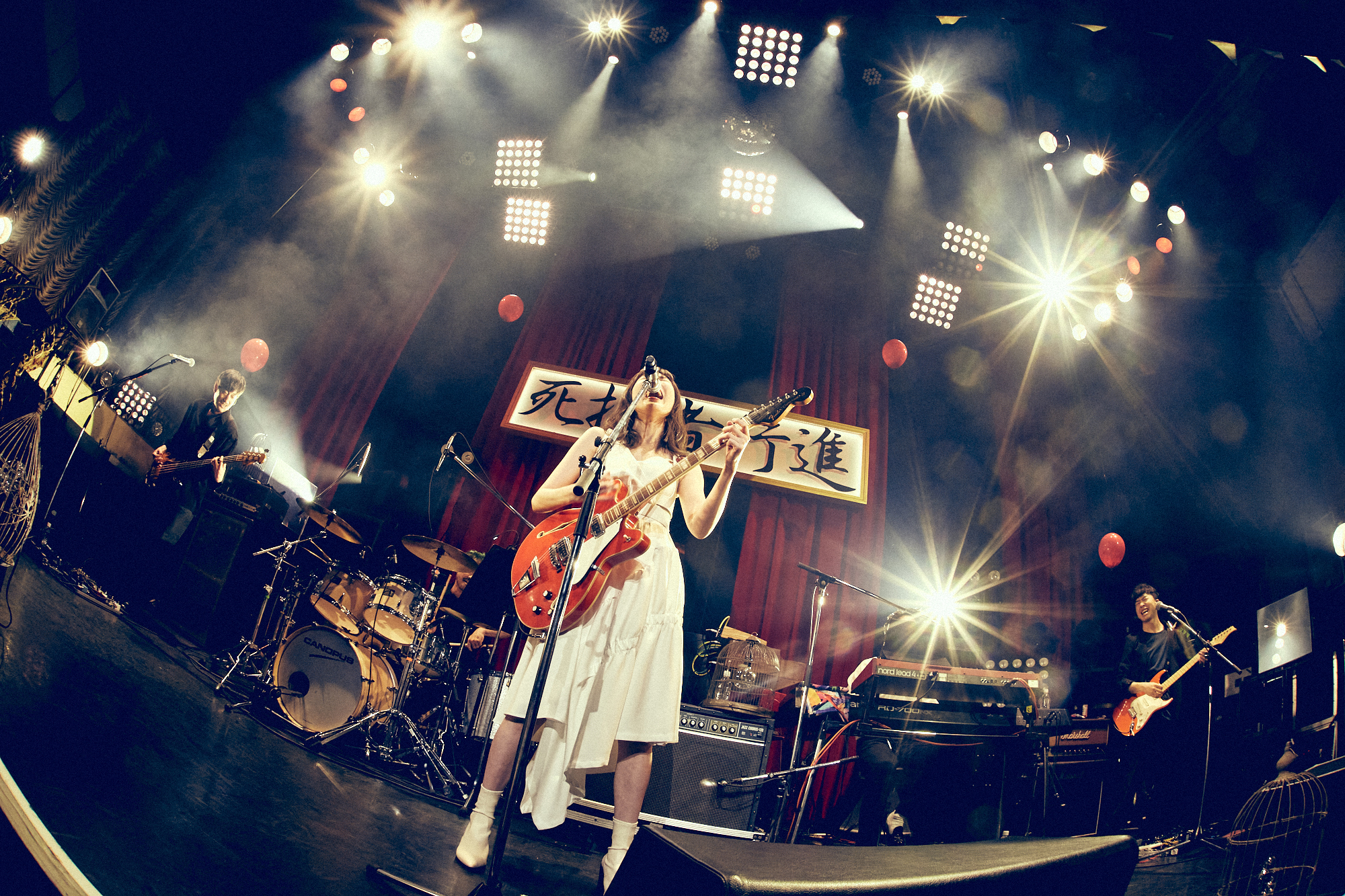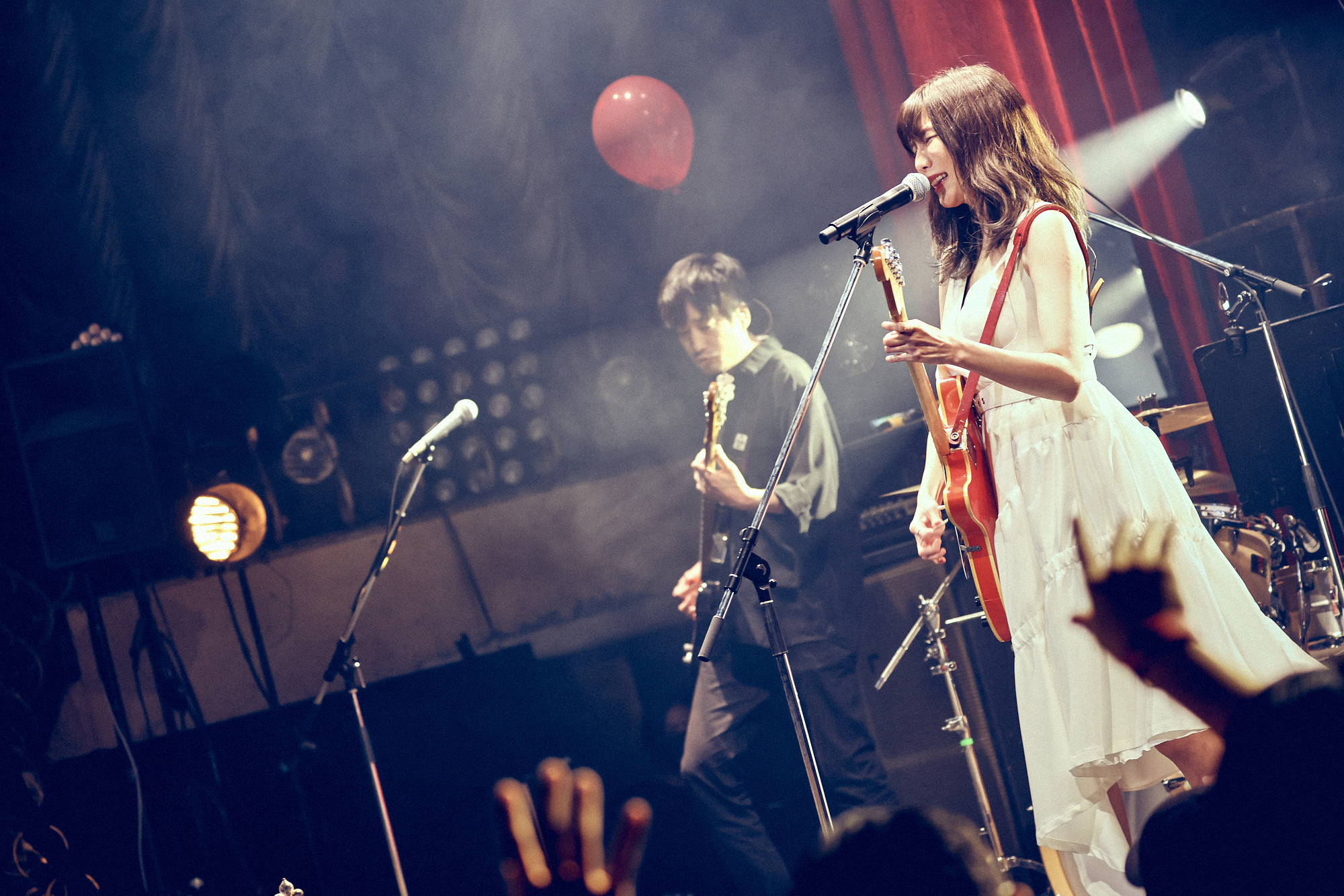 雨粒のように再会しよう、私たちはもともと一つのかたまりだったのだから──。謎めいた物語風のナレーションが開幕を告げると、すかさず真っ赤なフェンダーが唸りをあげる。東京キネマ倶楽部の名物、一段上のサイドステージを上手く使った衝撃のオープニングから、2曲目で早くも観客は総立ちだ。「音楽でひとつになろう!」と煽る渚は、清楚な黒髪に白のドレスワンピース。「虎視眈々と、淡々と」など、序盤から攻撃的キラーチューンを繰り出しつつ、アルバム『死に損ないのパレード』からの「合わせ鏡」では、包容力あふれる歌で観客を抱きしめてみせる。感情の振り幅が実に広い。
