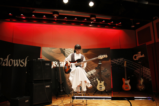 撮影が行われたのは、山野楽器の銀座本店7階にあるイベント・スペースJAM SPOTだ。ステージには4ブランドのベースがスタンバイしており、MINAはそれを見るなり、「たくさん用意していただいて」と嬉しそうに目を輝かせていた。