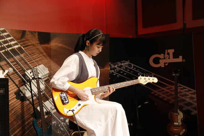 MINA:いかつかったですね、ちょっとパリビな感じがしました(笑)。演奏してみたらサウンドも自分のイメージしているような音でした。他のメーカーのベースよりも、ちょっと尖っているような音というか、そこが個性的でいいと思います。ちょっと重いので、私だとライヴで使うのは厳しいかもしれませんけど、レコーディングではすごくいいと思います。こういうベースも欲しいなと思いました。フレットが金色なのもかわいい。