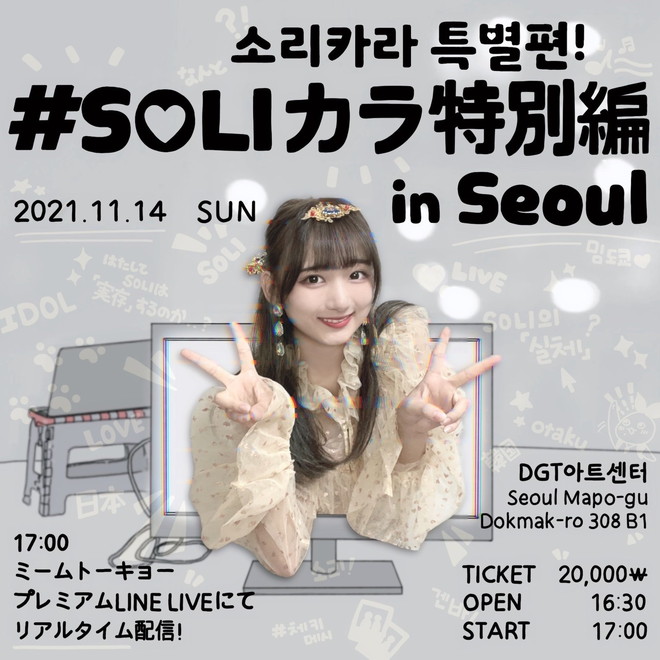 また韓国在住のメンバー・SOLIは、11月14日17時から韓国・DGTアートセンターでライブ<#SOLIカラ特別編 in Seoul>を開催。ライブの模様はミームトーキョーのプレミアムLINE LIVEにて配信も行われる。