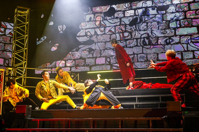 ここで古川と池田がステージの逆サイドに立ち、「夢で逢えたら」をデュエット歌唱。聞くたびに透明感を増してゆく美しいハーモニーが休戦を告げるが、それも束の間、今度は他の7人によるダンスバトルが開幕する。目に眩しい赤と黄色の一団がソロで、集団でぶつかり合い、殊にジャンと飯島の長身ふたりによるダイナミックなムーブの狭間から、身軽な志村が跳び上がるファイヤーの攻撃は見応え十二分だ。