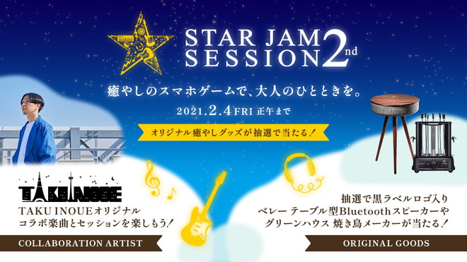 全国の対象チェーンでは、TAKU INOUEのロゴが印刷されたコンビニエンスストア限定「サッポロ生ビール黒ラベル『STAR JAM SESSION 2nd』キャンペーンデザイン缶」が11月15日(月)より数量限定で順次販売。デザイン缶に貼られた専用応募シールのQRコードからは、TAKU INOUEの楽曲を使用したオリジナルのスマホゲームで遊べる。