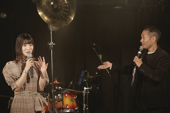 続いて歌われた「今君にすぐ君に」は光が放たれるようなブライトなナンバーで盛り上がるステージに途中からさわやか五郎もドラムのスティックを手に乱入して踊ったりとノリノリ。エンディングでドラムの前にセッティングされたシンバルを叩こうとするものの、いつのまにかスティックを手にしていた川音に先を越されて、呆然。「ちょっと! おかしいじゃないですか? 今日は俺が叩くって言ってたのに」と段取りと違うことを訴えると川音は大喜び。「近くに来たから(五郎を)どかせないとと思って」としてやったりの表情を浮かべていた。
