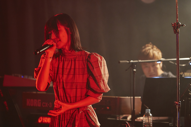 川音が歌う姿までも赤い照明に染まっていった代表作のひとつ「赤い涙」では内に秘めた情熱と儚さを感じさせるヴォーカルに惹きつけられ、“4部作”の4曲目に当たる「もう一度」では喪失感と断ち切れない切ない想いを浮かびあがらせる。そして「BARKSさんの記事で解禁になったんですが、5作目が完成しましたので次はその曲を歌いたいと思います」という嬉しい言葉とともに新曲「白い約束」を披露した。ピアノの旋律で始まるナンバーは川音の透明な高音を活かしたフォーキーなテイスト。不安と期待に揺れる女子の想いを歌った曲にみんな聴き入り、やがて温かい拍手が響きわたった。