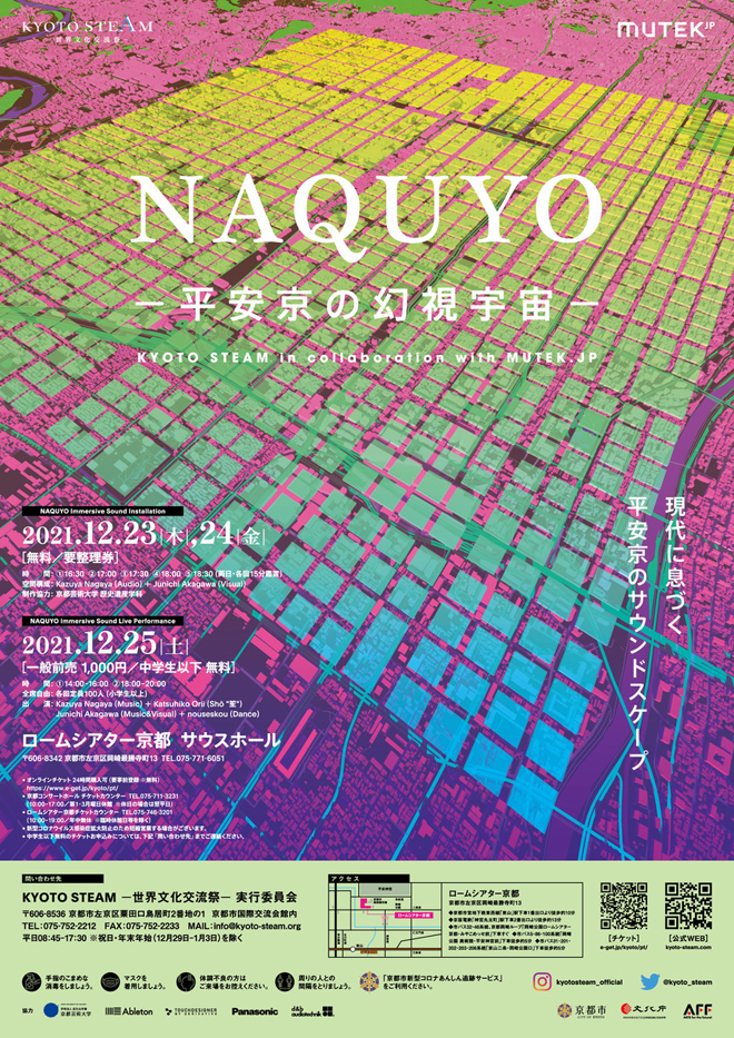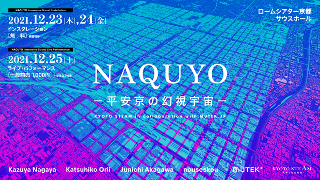 アート×サイエンス・テクノロジーの祭典<KYOTOSTEAM – 世界文化交流祭 – >と電子音楽とデジタルアートの祭典<MUTEK.JP>のコラボレーションによる、1200年前の平安京のサウンドスケープ(音風景)を創造するアートプロジェクト<NAQUYO – 平安京の幻視宇宙 – >は、2ヵ年に渡るプロジェクトの集大成となるライブ公演<NAQUYO Immersive Sound Live Performance>を、2021年12月25日(土)ロームシアター京都サウスホールにて開催する。