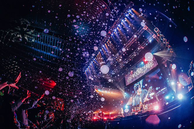 そんなMCを受けての「サークルバンドに光を」は、大学時代に結成されたいちバンドが、ついに大阪城ホールワンマンにまでたどり着いた今を感動的に響かせる。こやまが「ラストスパート、楽しんでいけよ!」と口火を切ったクライマックスには、「とりあえず噛む」「癒着☆NIGHT」「ヤバみ」と、熱量の高いパフォーマンスとド派手な照明とのシンクロでとことん攻め立て、「いつでもいいから、みんな自分のタイミングで、絶対ライブハウスに戻ってきてください!」と、ホームグラウンドへの溢れる愛を届けた「Give me the Tank-top」、タンクトップフェアリーなる18名のダンサーとフィナーレを飾った「かわE」で本編は終了。