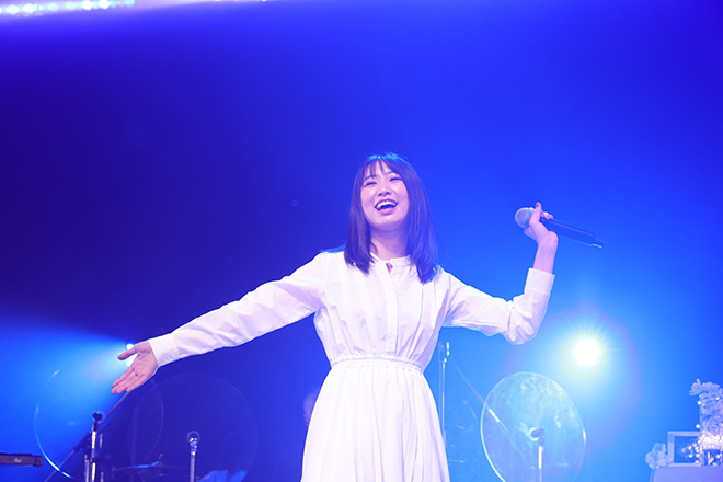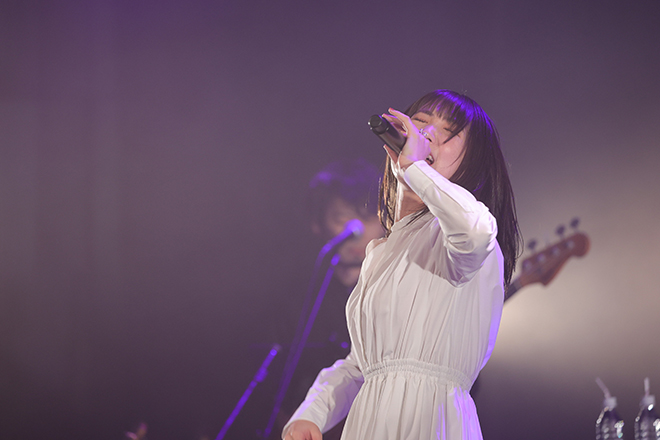 本編ラストは「ヒロインにはなれなくて」のリード曲でもあり、川崎鷹也が提供した「愛しい人、赤い糸」。切ない片想いソングではあるが、「ツアーで歌い続けるうちに、愛しい人を想う「大切さ」「温かさ」の部分がすごく強くなってきた曲。ここにいる大切な皆さんへ向けて歌います。」と話し、振り絞るように全力で歌い上げた。