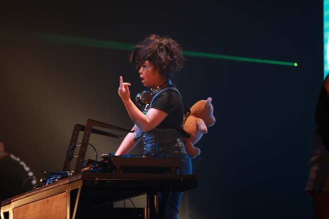 この空間を巨大なCLUBへ塗り替えるよう、次に登場したのがKIDS DJのDJ Skullnicole。彼女はアゲアゲな楽曲を次々と繰り出し、フロアにいる人たちの気持ちを騒がせる。この日の公演は声を出すことが禁止。気持ちが上がった観客たちは、騒ぎたい思いを熱い手拍子に変え、DJ Skullnicoleへ向けぶつけていた。観客たちが体を動かせない代わりに舞台上でダンサーチームが踊り、DJ Skullnicoleもプレイしながら踊りも見せていた。次々と表情を変えながら、DJ Skullnicoleはフロア中に熱い空気を作りあげていった。