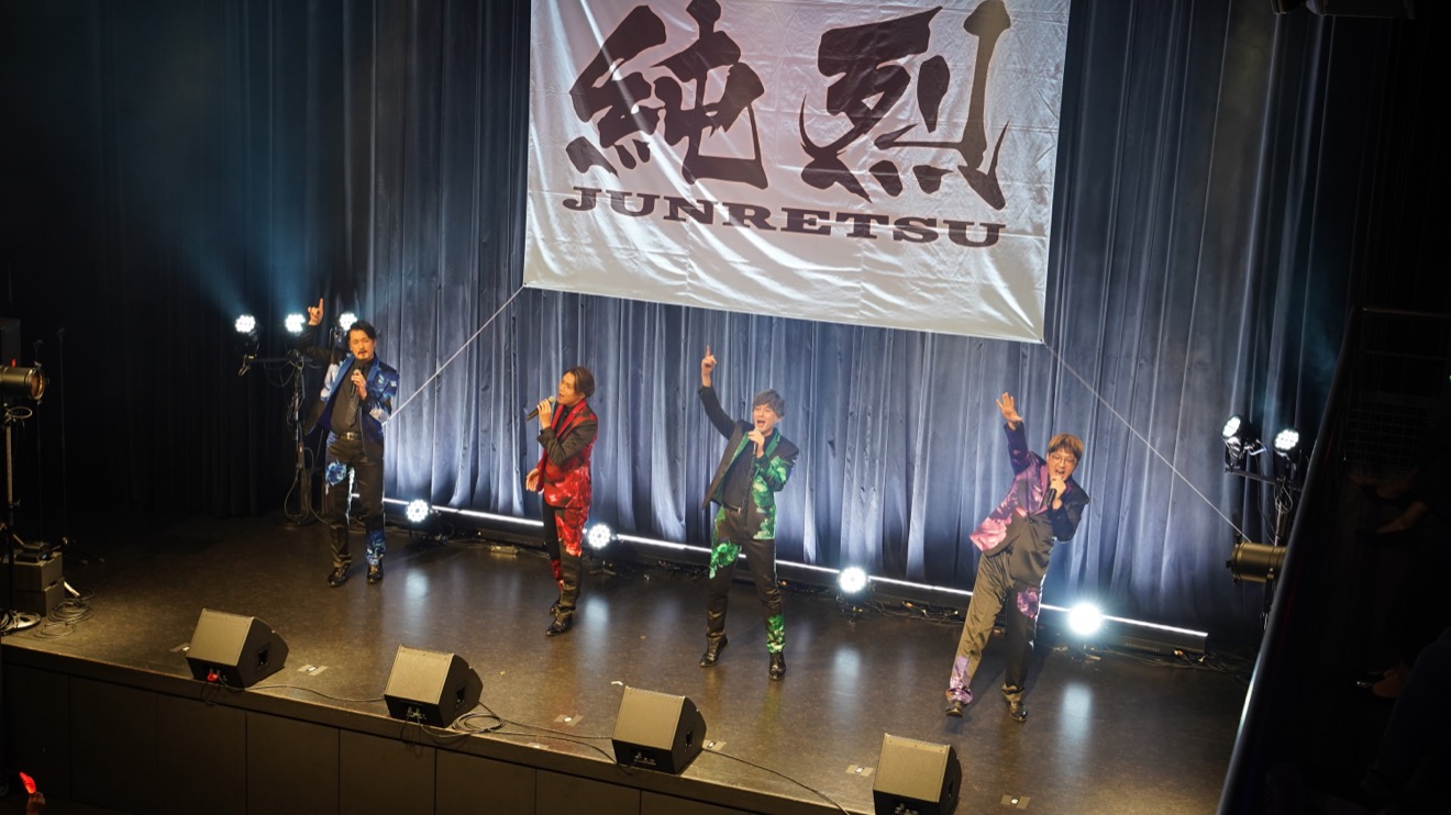 オープニングSEが流れ、メンバーが登場すると、今年9月に公開された初主演映画「スーパー戦闘 純烈ジャー」で戦闘シーンで使用された「勇気のペンライト」からスタート。ソーシャルディスタンスで1席空けながらではあったが、ペンライトの灯で埋め尽くされた客席と一体となった空気が流れた。MCではリーダー酒井が「先日は大きい会場のLINECUBE SHIBUYAでライブをさせてもらったけど、ライブハウスだと健康センターと同じように客席が近くてお客さんの顔がよく見ることができるのがいい」と語った。