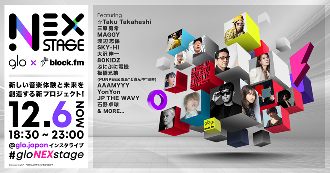 “満足感をブースト”をメッセージに掲げる「glo(TM)️」と10周年を迎えた新世代の音楽マルチメディア「block.fm」は、 2021年12月6日(月)、 アーティストとともに音楽のネクストレベルを創造する新プロジェクト「NEX STAGE」を発表する。