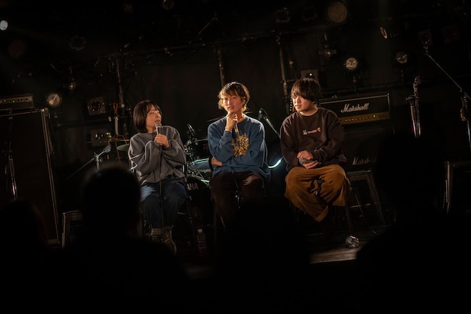 ずっとこの音に揺られていたいと思いながらも演奏が終わり暗転、本日3回目のMCに入ると、「映画にしていただいてありがたい。曲の持つ力のようなものを映画にしていただいた」と改めて感謝を伝えつつ、「プルオーバーズにしてはストレートな歌が多い」と先日発売となった3rd ZINEについてを語ると、「最後の曲。自分史上1番明るく恥ずかしい歌詞を書いてしまったなという曲を」という言葉と共に「雪解けのうた」を披露。3rd ZINE収録楽曲6曲の演奏が全て終わりライブパートは終演、トークパートへ。