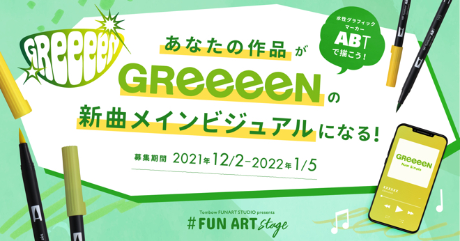 受付期間は12月2日から2022年1月5日までで、プロ・アマチュア問わず誰でも参加可能。キャンペーンサイトに掲載されたGReeeeNからのメッセージをもとに楽曲をイメージした作品を水性グラフィックマーカー「ABT」で描き、「#FUNARTstage」のハッシュタグを付けてInstagramに投稿することで応募できる。