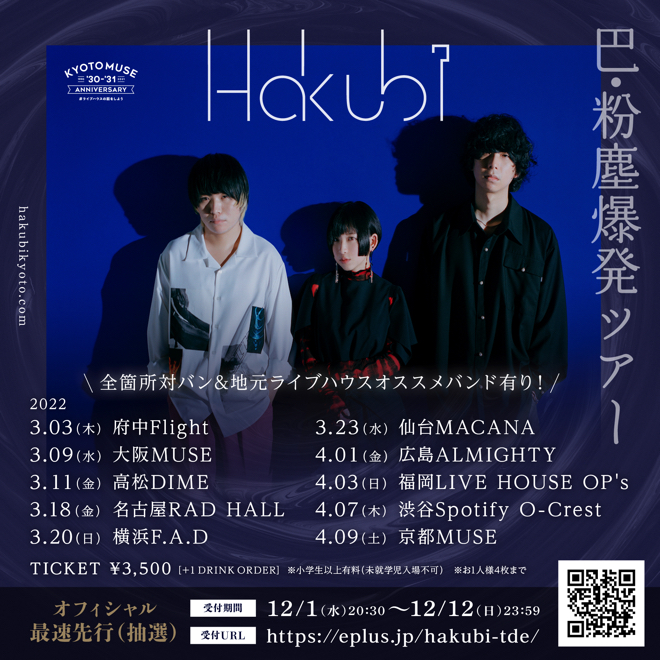 Hakubiは12月1日、メジャーデビューアルバム『era』のリリースに伴うライブツアー<傾(かぶき)・粉塵爆発ツアー>のファイナル公演をKYOTO MUSEで開催した。Spotifyでは同公演のセットリストに基づくプレイリストを公開中。バンドの公式Instagramアカウントではツアーのオフショット写真も公開されている。