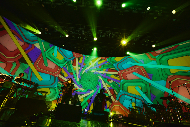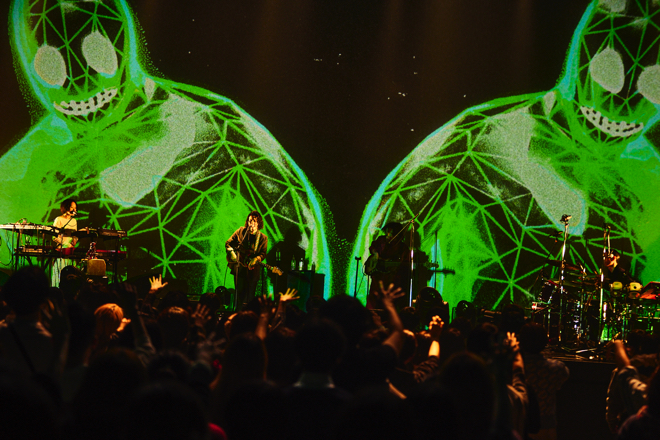 M5「未知との遭遇〜my name is GREENMAN」の合体曲は、流浪の民のアフロミュージックとでも形容したくなるディープなアンサンブルによってシラフで十二分に酩酊できるトリップ感があった。あるいはオイルアートの映像美とともにどんどん深淵なグルーヴを作り上げていったM8「Festival」、レトロウェーヴ的なシンセワークと郷愁が脳内をくすぐるメロウな歌メロがひたすら心地よかったM9「Odyssey」、フリーセッション的なイントロからとびきりストレンジかつキャッチーな聴き応えを湛えたM10「忍者ハッタリくん」(MONO NO AWAREの玉置周啓が『ゴーストアルバム』のために描き下ろした漫画もビジョンで躍動した)など、中盤の流れも『ゴーストアルバム』の楽曲と過去曲を有機的に共存させてみせた。そして、「あびばのんのん」収録のM11「とん」を皮切りに、今やシンボリックな存在感をまとっているM12「大東京万博」、名状しがたい清涼感させ覚えたM13「シンゴ」やM14「GHOST WORLD」という後半の流れは、まさしく小原がインタビューで言及していた「時間が経過することで生まれる聴こえ方の変化」=ライブで楽曲を練り上げることでブラッシュアップされるアルバムの世界を見事に体現するものだった。