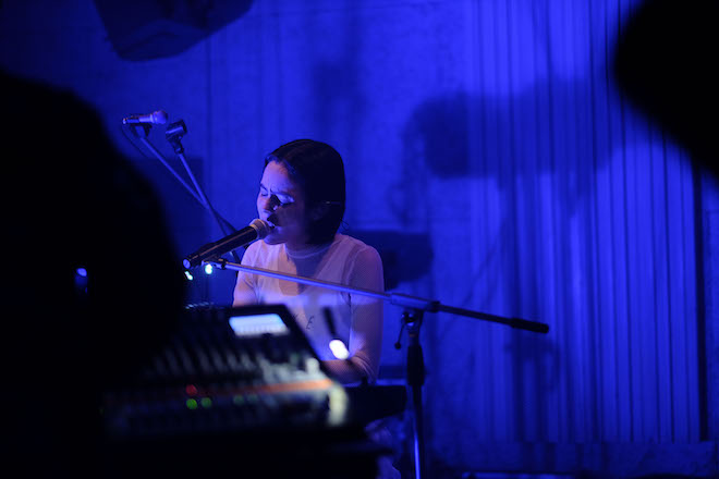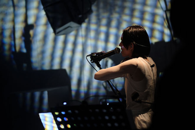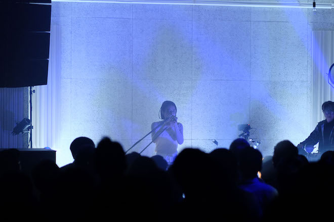 アルバムの1曲目でもある「I Was Swimming To The Shore And Heard This」のSEが鳴り始めると、観客を別世界へ引き込むように「Flower In The Dark」が始まった。Maikaのシルキーで浮遊感のある歌声と、重みのあるエレクトロサウンドが心地良い空間を作り上げていく。Maikaとサポートメンバーのマニピュレーター佐藤公俊(Sountrive)のみのシンプルなステージ編成だ。
