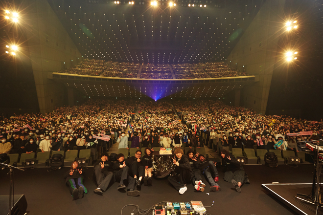 アンコールでは打ち込みのトラックに乗せて、川谷とほな・いこかがデュエットを聴かせる新曲「ドーパミン」を初披露し、バンドの新たな側面を届けると、さらには「ファンクラブの投票で一位になった曲」という「ルミリー」を演奏。このせつないメロディーの曲が一位になるというのが、やはりバンドの本質をよく表している。最後はindigo la Endのメンバー3人が全員ギタリストとして加わり、両バンドのメンバーにコーラスの2人を加えた全9人による「song3」! indigo la Endの3人がソロを弾いたり、お祭り騒ぎで曲を終えると、ちゃんMARIのピアノと後鳥の歌で「ハッピーバースデー」が贈られ、ステージにはケーキが運び込まれる。川谷がロウソクを吹き消すと大きな拍手が起こり、場内は親密なムードに包まれた。