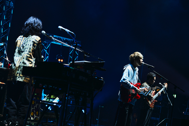 開演時刻を過ぎると、まずはメンバーのコメントをフィーチャーしたindigo la Endの紹介映像が流れ、これから始まるライブに向けての期待が高まる。そして、メンバーが登場し、一曲目に披露されたのは、メジャーデビューアルバムから「ワンダーテンダー」。後鳥亮介のベースがグルーヴを引っ張るアッパーな幕開けで、中盤のコーラスパートでは場内から一斉にクラップが起きる。続く「渇き」も長田カーティスのトリッキーなギターフレーズや、佐藤栄太郎による手数の多いプレイが際立つアグレッシブな曲で、こんなロックなモードで始まるindigo la Endのライブはひさしぶりかもしれない。