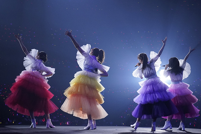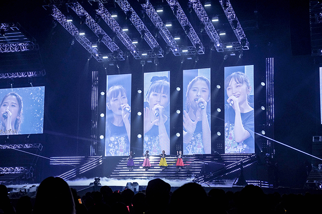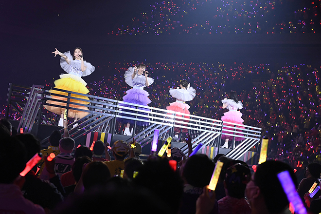 それぞれがトロッコに乗り込み、4色に染まったサイリウムで溢れる客席へと繰り出す。アッパーなダンスナンバー「Chai Maxx」を披露し、久しぶりのダンス合戦を楽しんだ。その後は約3年ぶりの歌唱となる「全力少女」を披露し、ラストは勢いのある「仮想ディストピア」でモノノフのテンションを大いに盛り上げ、一度ステージを後にした。