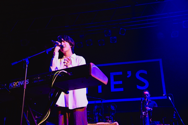 昨年開催された全国ツアー<SHE’S Tour 2020〜Re:reboot〜>では、緊急事態宣言発令によりファイナル公演のみ無観客開催に。今年はくしくも同じ日程・同じ地元大阪で、有観客&生配信でツアーを締めくくることとなった。ソールドアウトとなった会場が青い光と大きな拍手に包まれる中、巨大なバックドロップが舞台上に掲げられると同時にメンバーが登場。井上竜馬(Vo,Key)の「大阪SHE’Sです、よろしく!」の第一声を合図に、冒頭の「追い風」から楽曲の起伏とシンクロした照明ともども、結成から10年の時を重ねてもみずみずしさを失わないバンドサウンドを響かせる。オリエンタルなビートに心躍る「Masquerade」を経由し、「本日のスペシャルゲストはサックス、永田こーせー!」と井上が呼び込み、ここからは華やかなホーンの音色で躍動感に色付けた「Over You」に加え、服部栞汰(G)の艶やかなギターとの絡みでも魅せた「Do You Want?」と立て続けに披露していく。