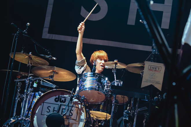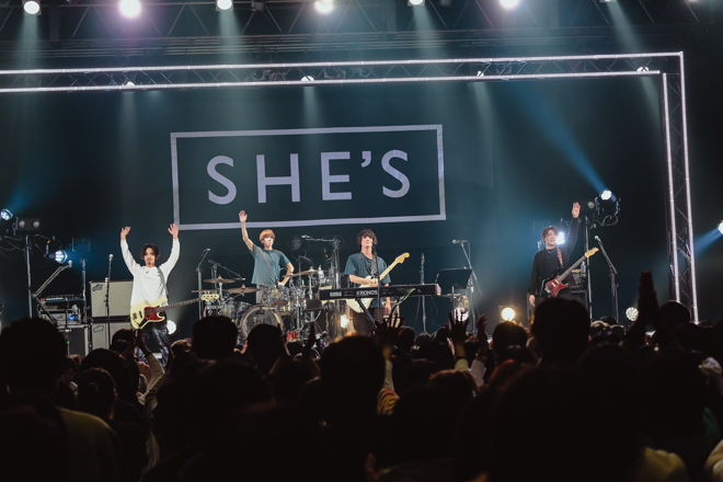 「中学高校の頃から、思い返せばずっと音楽に救われてきたと思うんですよね。何か孤独を感じてしまう、独りな気がする、不安が押し寄せる、そういう夜が俺にはいっぱいありました。そのときにホッとしたり、元気付けられたり、一緒に悲しんでくれたり……自分にとって音楽は、お守りのように持ってるだけで安心するものやったんやなって。SHE’Sの音楽が、たった1分でも1時間でも、願わくば1年、10年、息絶えるその日まで……とは言わないですけど、できるだけ長く、これだけ人間がいる中で俺たちを見つけて、顔を合わせて、音楽を共有するあなたの、そんな存在になればいいなと思って。その全ての決意をアルバムの最後に歌にして入れたので、今日はそれを歌って終わろうと思います」
