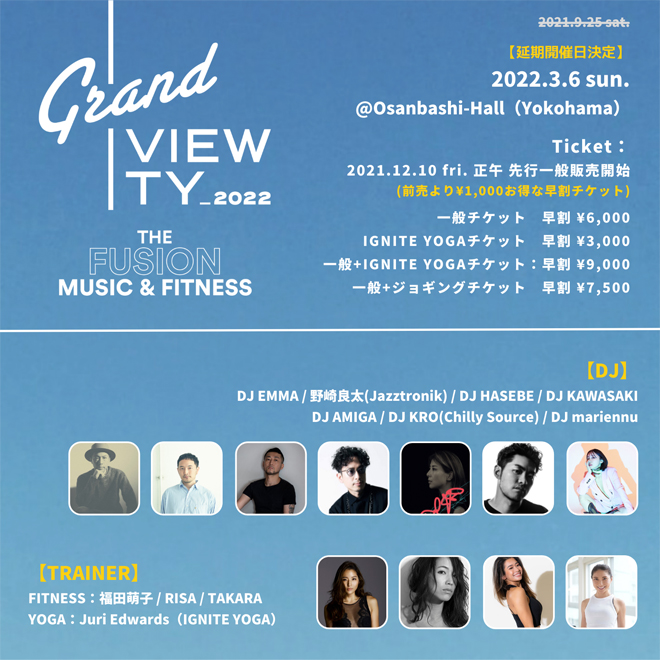 2019年から開催している<Grand VIEWTY>。今回のテーマは “MUSIC & FITNESS” 。実力派DJ陣と豪華なフィットネス&YOGAトレーナーの面々がコラボする1日限りのスペシャルプログラムが横浜・大さん橋ホールで楽しめる。
