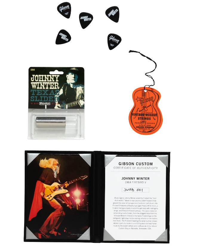 本製品には、伝説的な写真家であるミック・ロックが撮影したジョニー・ウィンターの名盤『Captured Live』のジャケ写で有名なアイコニックな写真も含まれる。さらに、専用ハードケース内には、認定書の他、スライドバー、ジョニー・ウィンター/ ギブソン カスタムショップのダブルネーム・ピックも付属する。