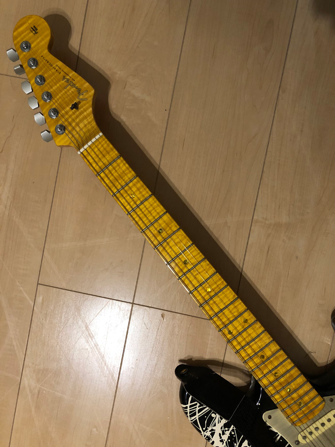 リサイクルショップで埋もれていたギターも、所有者次第でどのようにでも生まれ変わるという典型例ですね。こんな塗装のボディは見たこと無いけれど、オリジナルなのだろうか。前オーナーによるプリントだとしたら、かなりの腕前とお見受けします。てかネック、超カッコいい。(JMN統括編集長 烏丸)