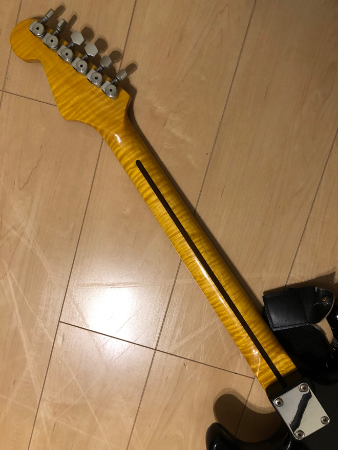 次に再会したのはなんと一年後。「まだ売れてなかったのか、お前。」と驚きながらも、「それなら俺んとこに来るか。」と聞くと頷いたようだったので、(お金払って)連れ帰りました。ネックが反っていてかつチープだったので、真鍮?のピックガードと5Aのメイプルネックを取り付けるとますますルックスがかっこよくなったので、満足してその後ライブでも使いました。