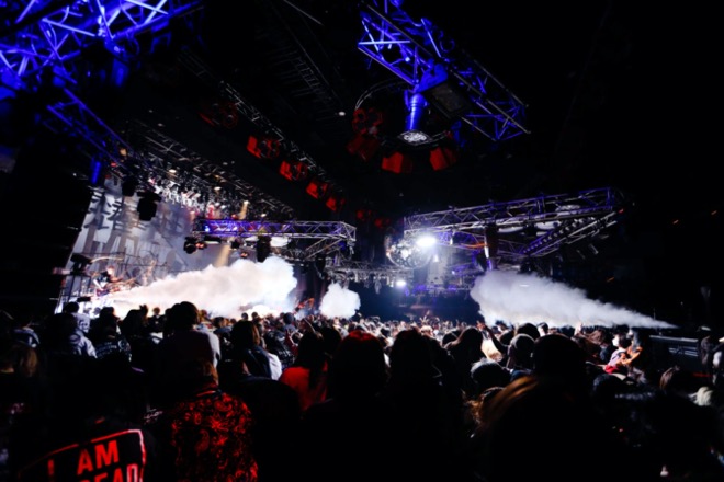 この吉報を受けてからの「優しい歌」と「ハイデ」がいつも以上に晴れやかなものとして聴こえたのは、きっと筆者だけではなかったはず。そのうえ、MUCCのライヴといえばまず欠かすことの出来ない「蘭鋳」では、新木場COAST名物の巨大照明トラスが観客らの頭上近くまで降下したことに加え、CO2の大量噴出で、あたりが濃い煙幕に席巻される事態が勃発したのだ。終演後にアップされたミヤのTweetによると、なんとあのCO2は“MUCCからの奢り”であったらしい。ハコの特性を最大に活かした爆音の嵐と粋な演出により、あのとき夢烏が声こそ出せなくとも狂喜乱舞していたのは言うまでもない。