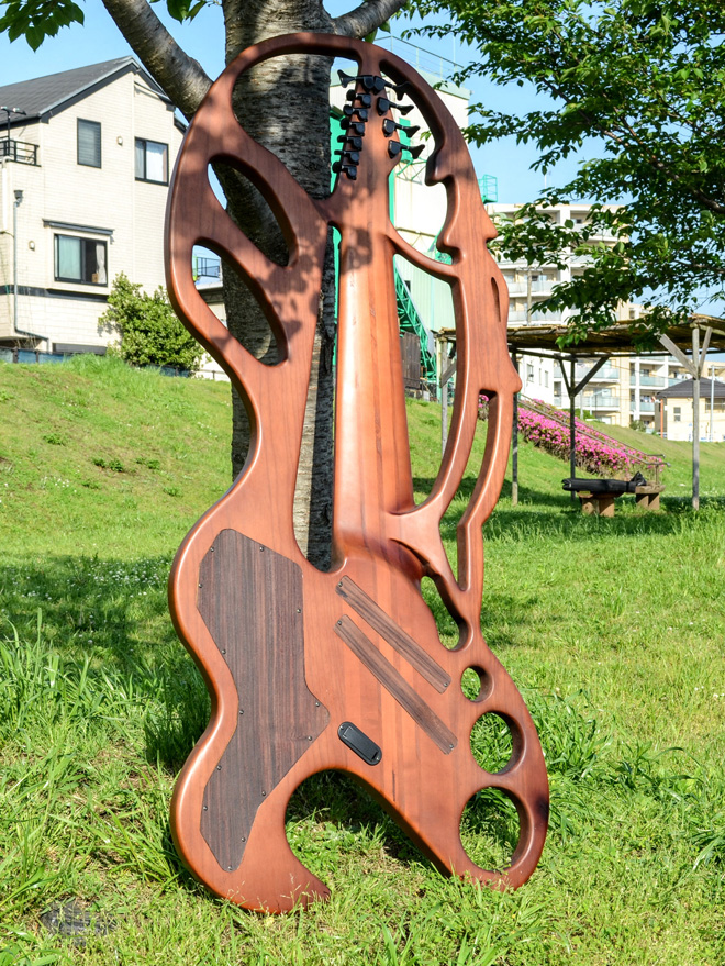 少々奇抜なデザインのベースですが、200年後くらいには文明の高度化に伴い、いつしかベースはギターの弦数を超え、22コントロール、33ピックアップのエレキベースが台頭していてもおかしくないと想像します。その頃には私はきっと生きていませんが、選択肢の一つとして後世にこのジャンルを残していきたいと思っています。