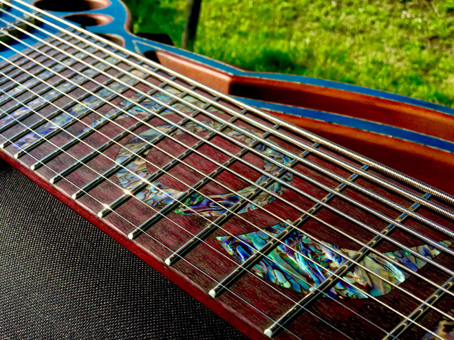 まず1つ目がアバロン貝の指板インレイです。多弦ベースは当たり前ですが指板が広いことが大きな特徴で、これを最大限活かしたいと考えていました。指板を大きなキャンパスに見立てて、12フレット付近には大きめのアバロン貝の装飾を施しています。この巨大指板インレイは、螺鈿(らでん)工芸が有名な韓国の老舗家具屋に依頼しました。自然光を受けて幻想的に輝く指板インレイは眺めているだけで癒されます。