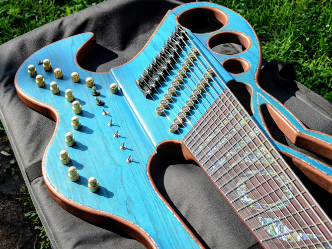 やべーの来た。これは楽器のふりをした武器なのか?家具なのか?アートなのか?凡人の私にはアバロン貝のインレイが綺麗ということしかわからない。「22コントロール、33ピックアップのエレキベースが台頭していてもおかしくない」と妄想している時点で、重篤な楽器疾病患者さんであることは間違いない。日本にもこんな突き抜けた変態がいたことに、全員背を正して敬礼だ。(JMN統括編集長 烏丸)