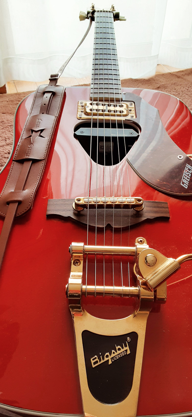 「アコギにアーム?」って思いがちですが、ちょっと待った。逆に「何故アコギにはアームがないの?」ってところですよね。アコースティックサウンドにも心地よいアーミングが加われば、表現力が格段に増すというもの。これ最高。普通のアコ/エレアコからもう1段階飛び抜ける時、G5034TFT Rancherは最強のお供です。てか緑地にオレンジが映えますね。(JMN統括編集長 烏丸)