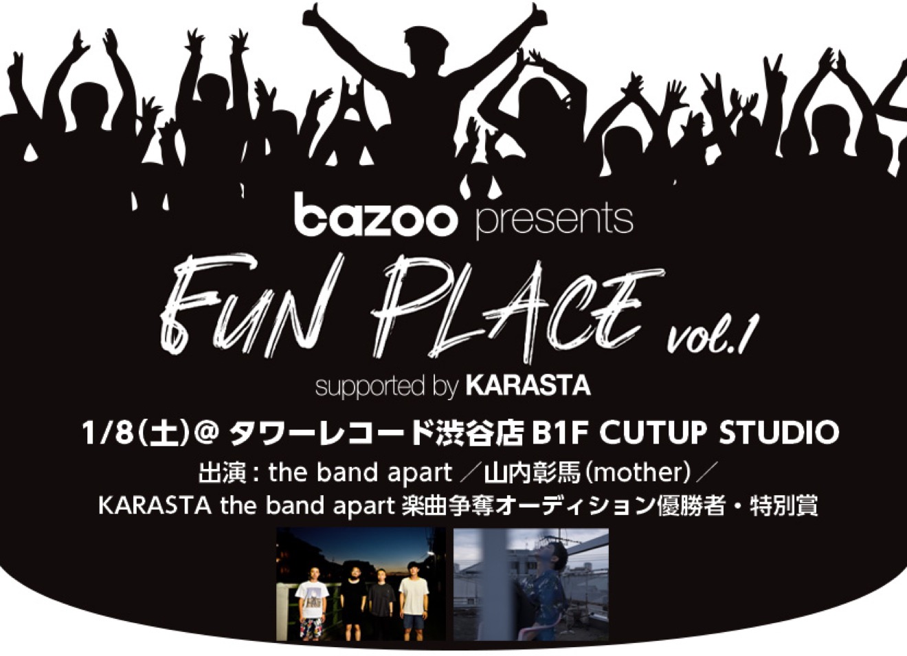 アーティスト総合支援プラットフォーム「bazoo」発のイベント<bazoo presents Fun Place vol.1>が、2022年1月8日にタワーレコード渋谷店 CUTUP STUDIOにて開催される。